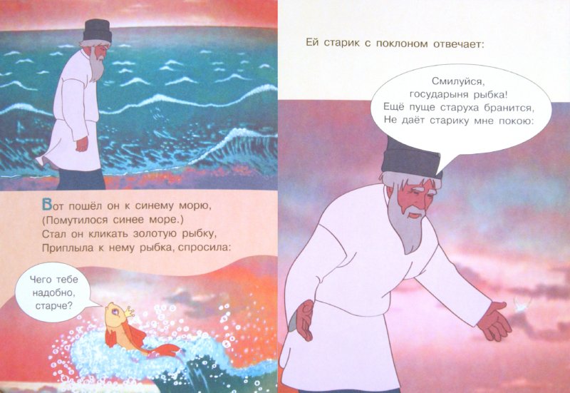Затем старик вернулся на берег моря, где беспокойно пенился океан, он громко позвал золотую рыбку. Золотая рыбка подплыла и требует: