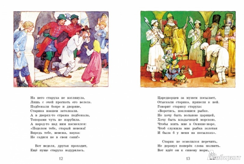 «Простите меня, Ваше Величество Золотая Рыбка! Что мне делать с моей проклятой старухой? Ей надоело быть царицей, Из морей она теперь хочет быть владычицей, С ее домом в голубых водах океана; Она хочет, чтобы ты был ее собственным слугой, Чтобы выполнять ее команды и ее поручения».![]()