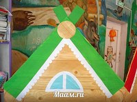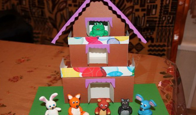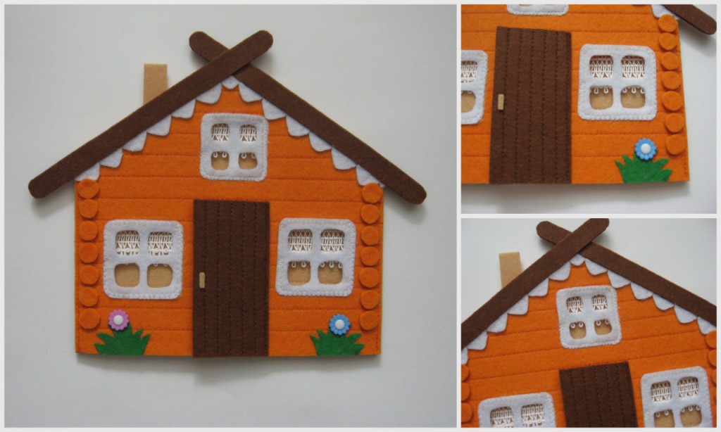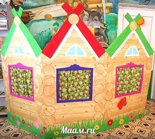 Для игры в сказку с такими куклами нам понадобится украшение – домик-теремок. Сделать это совсем несложно.