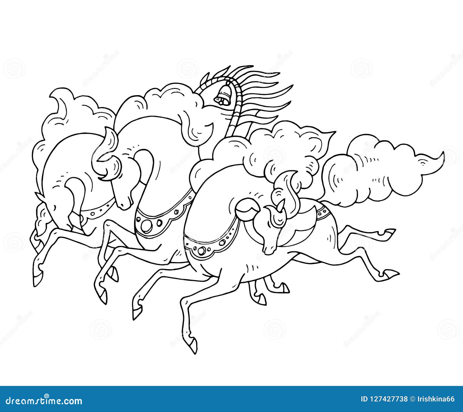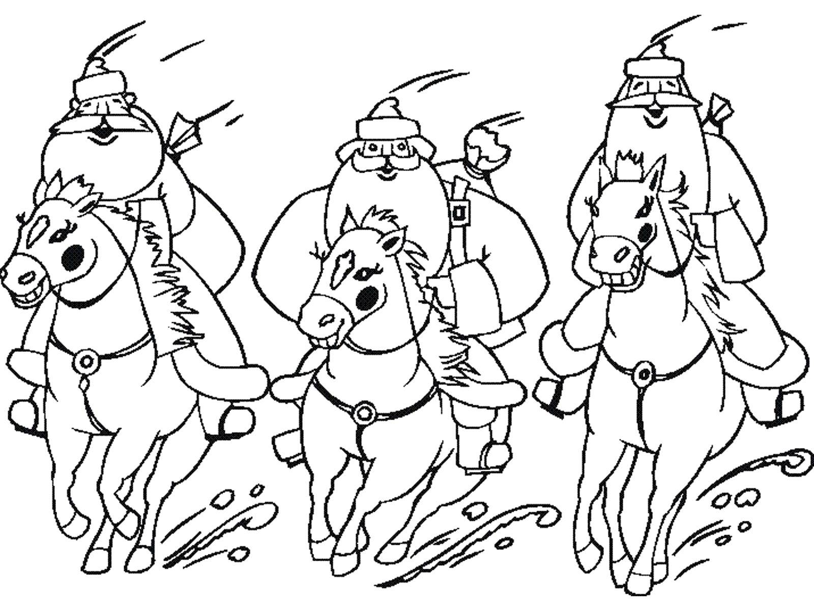 Вот еще две раскраски, где Дедушка Мороз едет на настоящих русских санях, запреженных лошадьми, и везет большую ель.