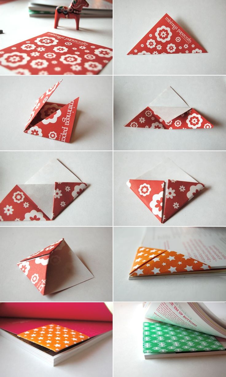 Попробуйте сделать свои собственные закладки – с помощью всего лишь квадрата бумаги и небольшого оригами вы можете сделать свои собственные яркие и забавные закладки, которые поместятся прямо в углу страницы.