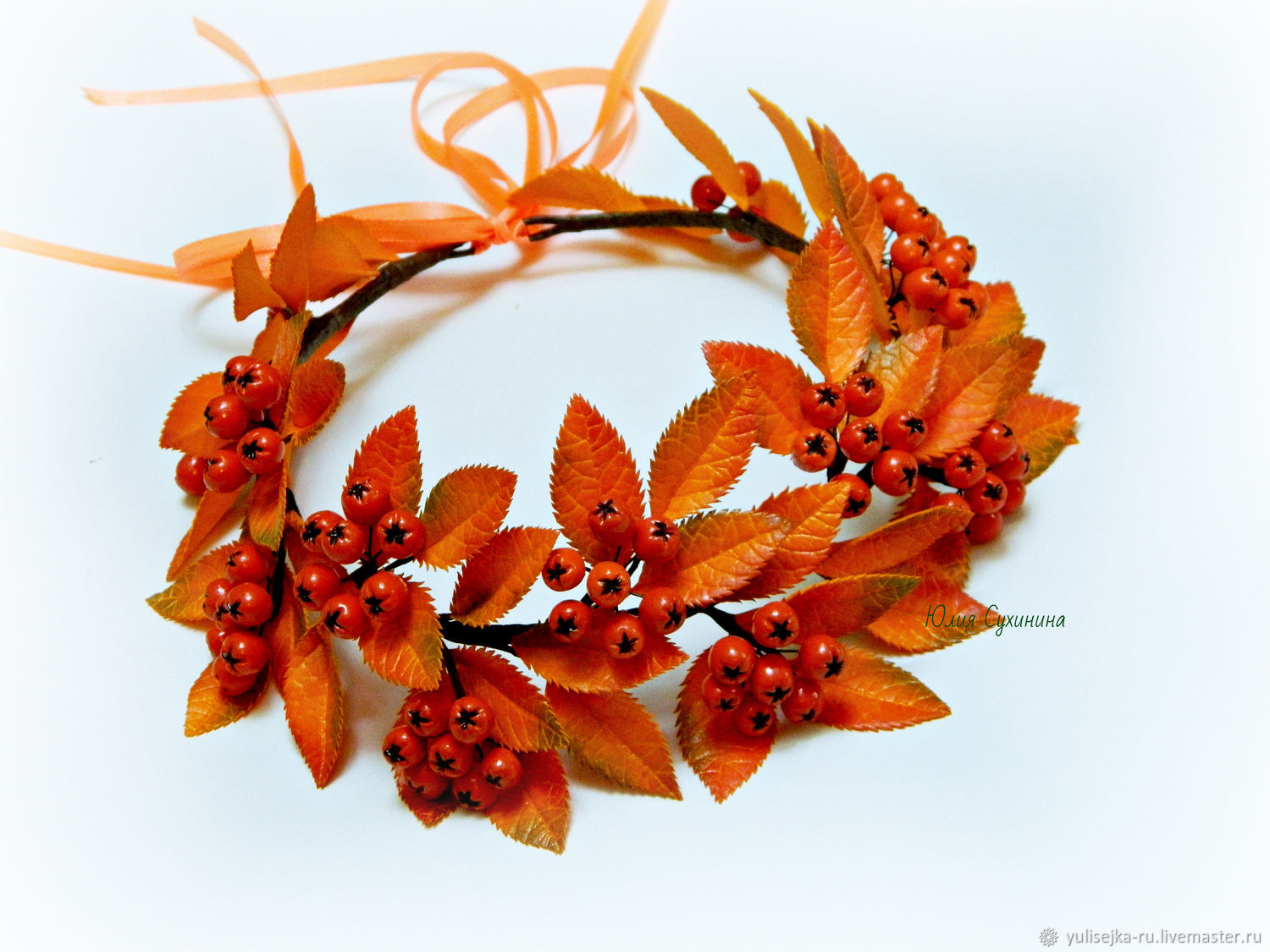 Вместо кленовых листьев можно использовать любые другие, а рябину легко заменить на калину или даже искусственные яркие ягоды. Основу для венка можно подготовить заранее или же использовать обычный ободок для волос. Впрочем, вы можете и вовсе обойтись без всего. Эту осеннюю поделку кто-то использует и по нескольку раз – он не завянет, но чуть-чуть подсохнет. И если вы планируете сделать венок для фотосессий на достаточно длительный период, основа должна быть прочной.
