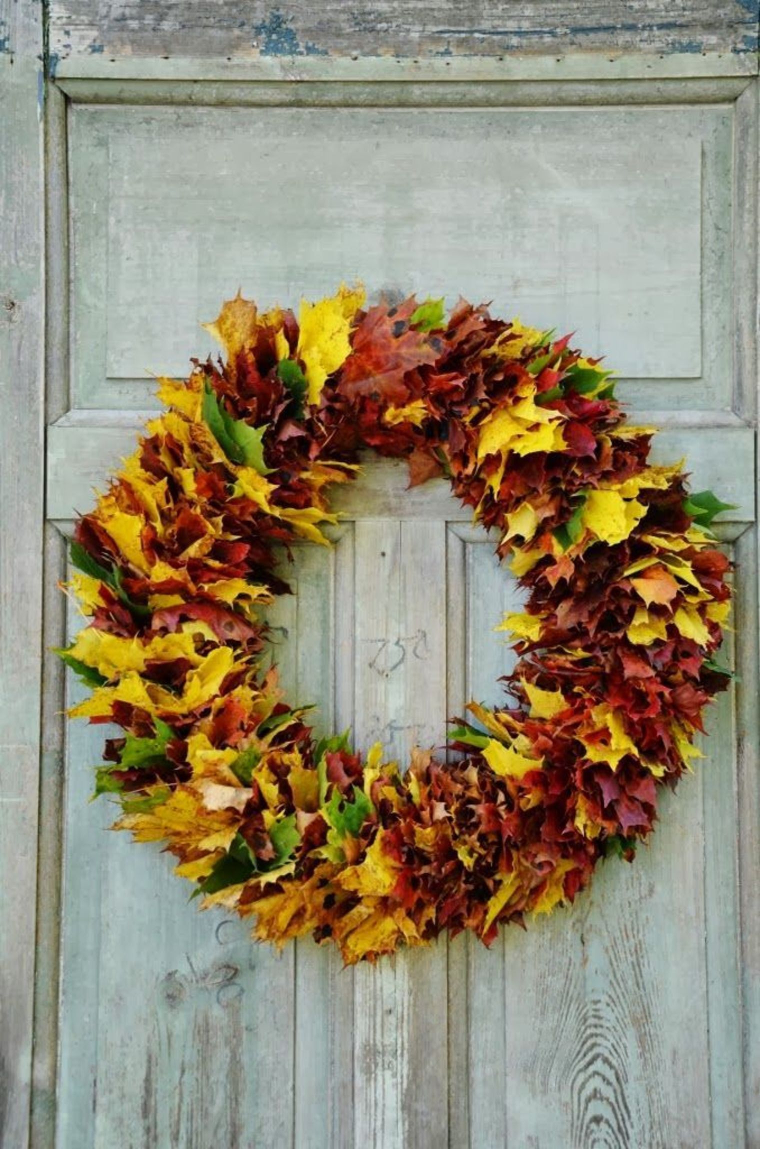 Декоративные венки на дверь, сделанные из осенних листьев — эффектное украшение. К тому же это один из самых простых способов украшения венка на дверь. Замечательно выглядит как венок из однотипных листьев, так и комбинированный вариант. Для того чтобы венок получился еще более оригинальным, добавьте к листьям сосновые шишки, каштаны, желуди, артишоки.