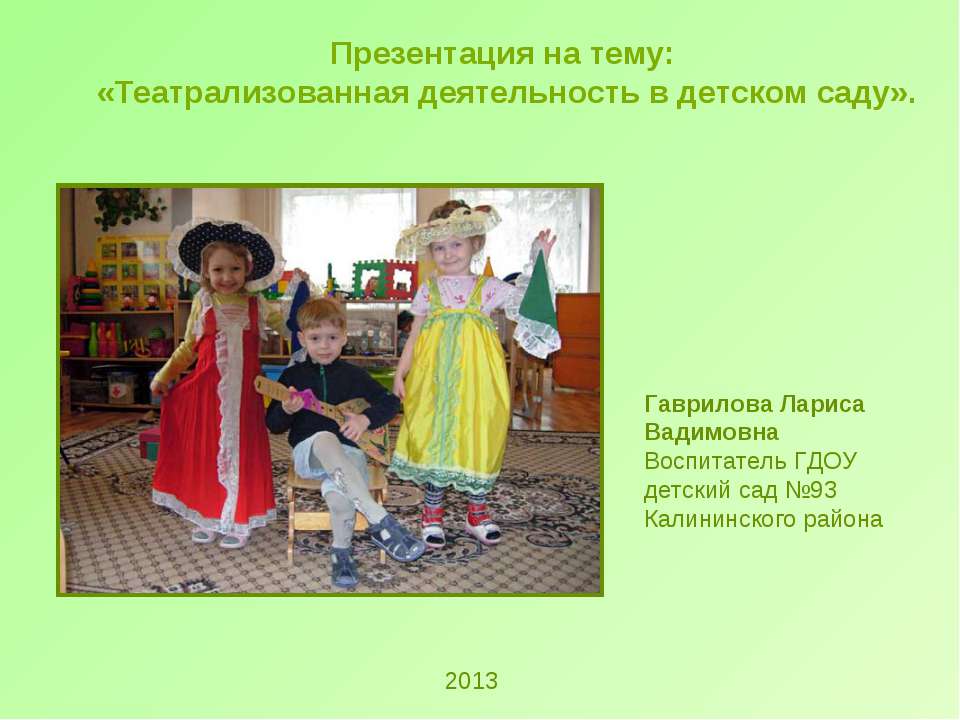 Формы организации театрализованной деятельности в детском саду МКДОУ №331 Воспитатель Апретова К.Н. Театрализованная деятельность в детском саду может быть организованна в утренние и вечерние часы – в нерегламентированное время; органично включена в другие занятия (музыкальное, по изобразительной деятельности и др.), а также специально запланирована в недельном расписании занятий по родному языку и ознакомлению с окружающим миром. Желательно чтобы все организованные формы театрализованной деятельности проводили небольшими подгруппами, что обеспечит индивидуальный подход к каждому ребёнку. Причем каждый раз подгруппы должны формироваться по-разному, в зависимости от содержания занятий. Занятия