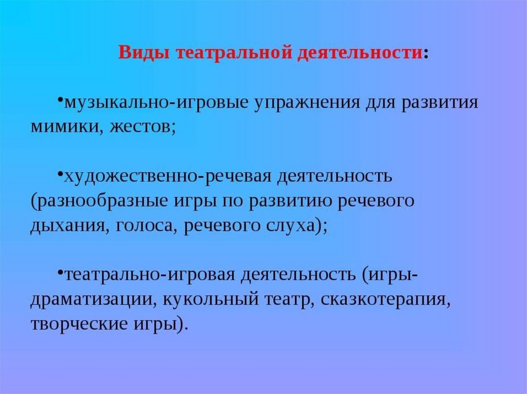 Типовые, которые включают следующие виды деятельности: театрально-игровую, ритмопластику, художественно-речевую, театральную азбуку (элементарные знания о театральном искусстве).