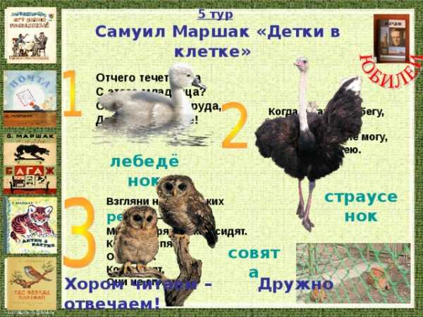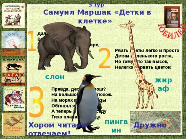 – Мы уже вспомнили названия некоторых стихов Маршака, а теперь давайте их попробуем их продолжить.