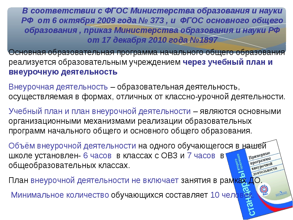 В соответствии с федеральным государственным образовательным стандартом начального общего образования (ФГОС НОО) основная образовательная программа начального общего образования реализуется образовательным учреждением, в том числе, и через внеурочную деятельность.