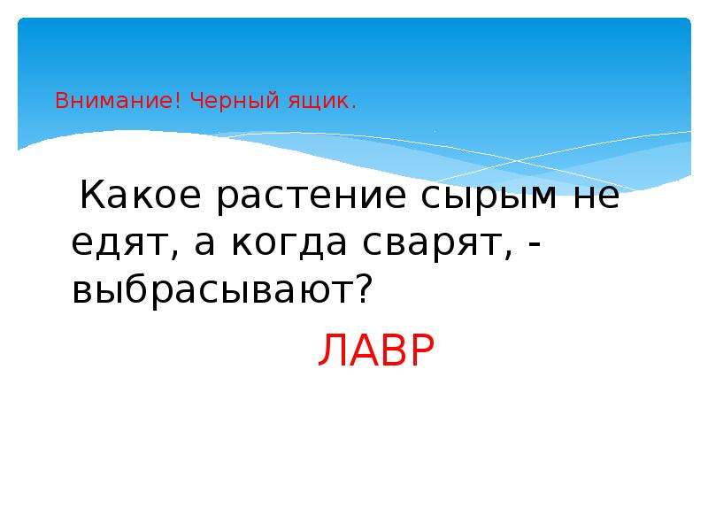 Чёрный ящик. И.А. Крылов всегда отрицательно относился к тем, кто не мог «за дело просто взяться», а пускался в глубокомысленные рассуждения, мудрствования. Этой теме писатель посвятил несколько басен, в том числе и эту. В чёрном ящике лежит предмет, наименование которого стало названием басни. Что в чёрном ящике? (Ларчик)