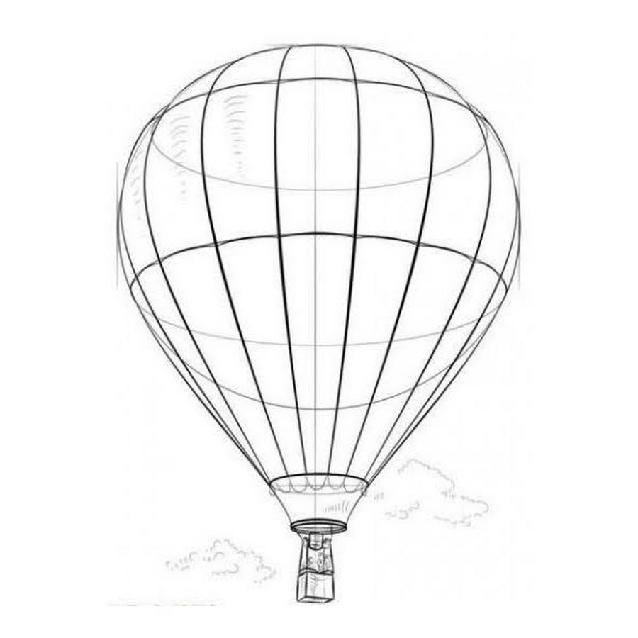 Шаг первый.Рисуем такую вот форму. Шаг второй. Теперь сделаем ровнее, должны получится геометрические фигуры. Шаг третий. Удаляем вспомогательные линии, обводим контуры. Шаг четвертый. Разделим его как мандаринку на дольки. Шаг пятый. Теперь тоже самое, только горизонтальные линии. И не забудьте прорисовать корзинку. У нас есть уроки рисования других летательных объектов и небесных тел, вот.