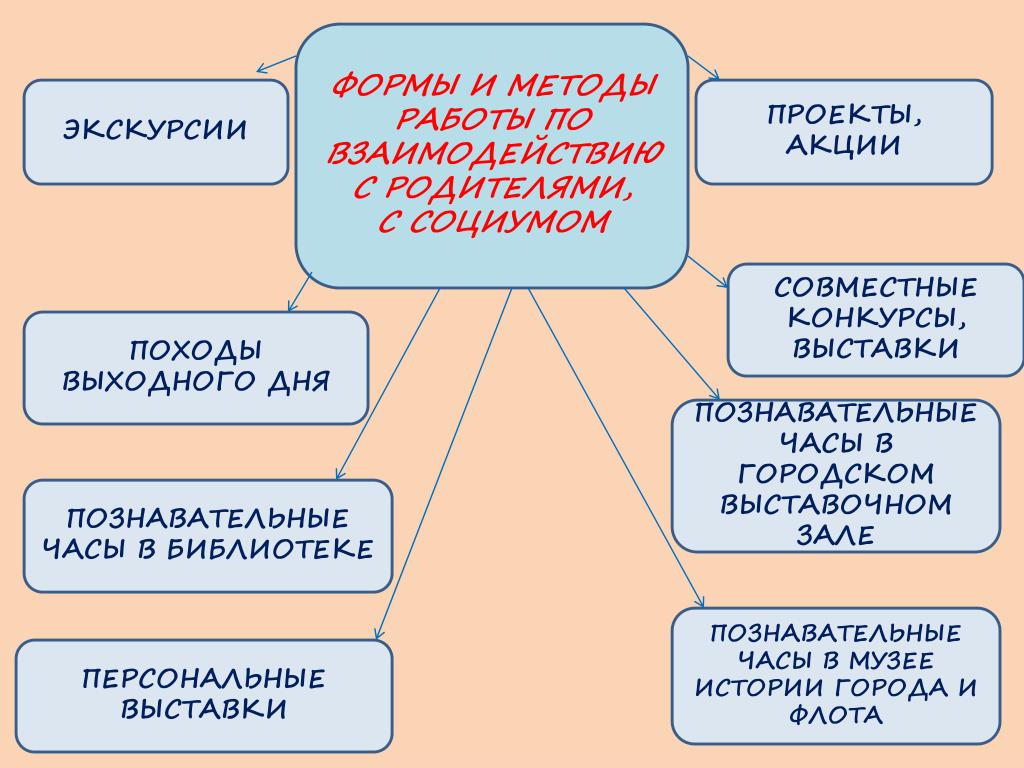 — открытые просмотры — совместные развлечения и праздники — концерты — посещение уроков, НОД; — совместные родительские собрания |