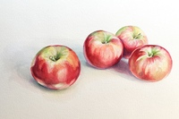 Последний шаг - сделать действительно темные области темнее (стебли и тени прямо под яблоками) и осветлить некоторые светлые участки. Я прочесываю более светлые участки вокруг стеблей, а также блики и отраженный свет с помощью маленькой жесткой кисти и большого количества воды.