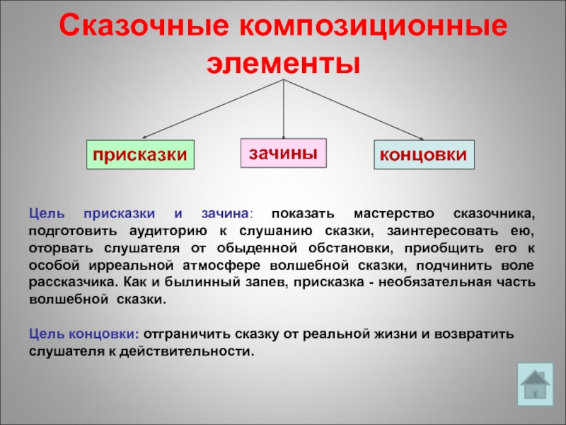 Их следует отличать друг от друга. Сложное композиционное построение народных сказок не является случайным. Каждая из имеющихся в них частей играет определенную роль.