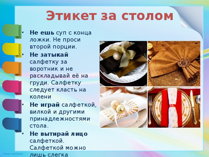 пальцы, случайно испачканные во время еды, осторожно вытирают верхней половиной салфетки, можно вытирать губы этой же салфеткой, если нет бумажных