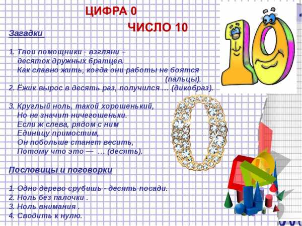 Обратите внимание, что младшие школьники часто путают понятие цифра и число. Предлагая эти загадки детям, напоминайте, что 10 – это число, состоящее из двух цифр, 1 и 0.