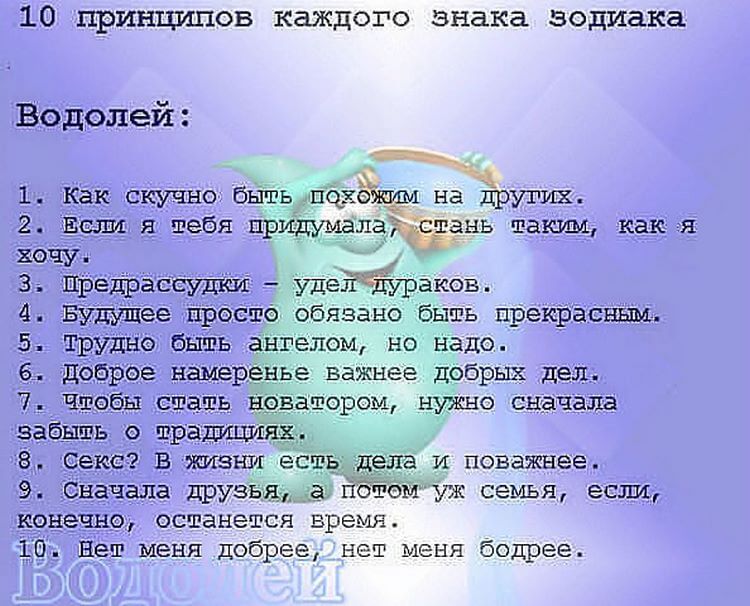Сказать Водолею, что у него уже давно и всегда все так хорошо, означает оскорбить его, причем серьезно. Потому что это означает, что он особо ничем не отличается и проживает свою жизнь как серая личность. Все у тебя хорошо, ты делаешь все как надо, живешь так, как положено! Ой, не шутите так! Водолей не живет как надо, ему чужды правила и установленные стандарты поведения. В отличие от Скорпиона, Водолей вносит смуту не только в свою жизнь: то, что он делает касается и общества! Поэтому когда ему хорошо и когда всему обществу хорошо, это означает застой! Как так, вы что, ребята? Давайте жить по-другому! И тут начинается скрип мозгов у людей: «Нее, ты что? Так не пойдет, нам хорошо и в нашем болоте, а ты зовешь непонятно куда!» Люди не понимали Сергея Доброздравина, который говорил несколько лет назад своим окружающим: