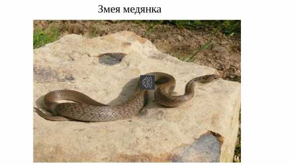 Пресмыкающиеся и рептилии Веретеница ломкая Класс: пресмыкающиеся. Ящерица из семейства веретеницевые, эта ящерица – ложноногая. Длина ящерицы достигает 50см., из них до 30см. длина тела. Название «веретеница» происходит от веретена, которое формой напоминает эту ящерицу, а «ломкая» от свойства отбрасывать хвост. Веретениц часто путают со змеёй медянкой. Весной активна днём, с наступлением лета переходит на ночной образ жизни. Для сна прячется в норки, кучи веток, гнилые пни. Медянка обыкновенная Класс: рептилии. Вид неядовитых змей рода медянок семейства ужеобразных. Длина тела до 90 см. От других змей отличается по наличию тёмной полосы, проходящей через глаз в совокупности со зрачком круглой формы. Медянки предпочитают поляны, солнечные опушки, сухие луга и вырубки в различных лесах, избегая сырых мест, хотя хорошо плавают. Ведёт дневной образ жизни, но иногда появляется из укрытий в сумерках и даже в ясные лунные ночи. В течение нескольких лет не меняет своих индивидуальных участков.
