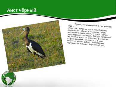 10 слайдАист чёрный Редкий, сокращающийся в численности вид Экология: встречается в лесо-болотных ландшафтах, обычно в сосняках, елово-широколиственных лесах, у озёр, болот, закустаренных пустошей. Гнездо устраивает на боковых суках и стволовых развилках старых деревьев. В кладке 2-5 яиц. Питается мелкой рыбой, земноводными, крупными насекомыми. Перелётный вид.
