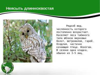 11 слайдНеясыть длиннохвостая Редкий вид, численность которого постепенно возрастает. Населяет леса таёжного типа вблизи верховых болот, ветровалов, гарей. Оседлая, частично качающая птица. Моногам. В сезоне одна кладка, обычно из 3-5 яиц.