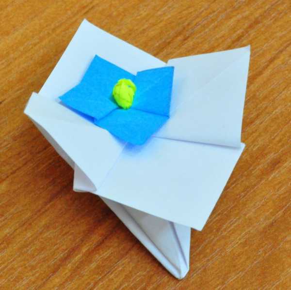 12. Загибаем хвостик бутона кверху до середины, потом, придерживая линию сгиба, разгибаем верх бутона, формируя цветок.