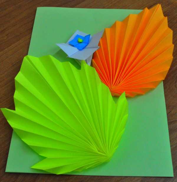 17. Теперь собираем открытку. Мы взяли лист зеленой бумаги, свернули пополам, создав шаблон открытки, теперь на титульную сторону мы будем приклеивать получившиеся элементы. Сначала листья.