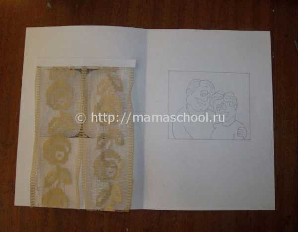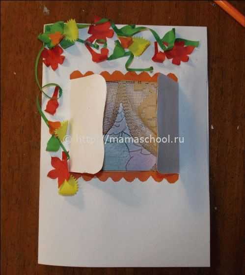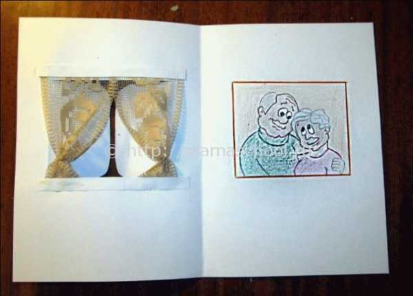 Закрыв открытку, намечаем, где же будет располагаться картинка и рисуем её. Одновременно к внутренней части окна приклеиваем занавески. Не торопитесь обрезать их — лучше сделать это после того, как приклеите их полностью.