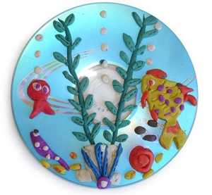 Ненужные компакт-диски сейчас, наверное, можно найти в любом доме. Используем его, как основу для поделки из пластилина. сюжет можно придумать любой: цветы, животные, бабочки, подводный мир, солнышко. Также пластилином можно подписать “бабушке” или “дедушке”. Дрелью сделать маленькое отверстие сверху диска и прикрепить ленточку, чтобы можно было повесить на стену.
