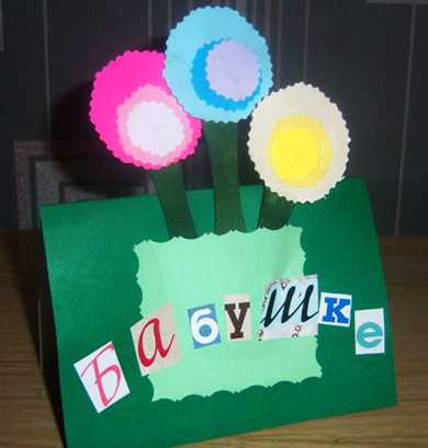 Можно сделать открытку, на которой, вырезанными из журналов буквами, написать «бабушке» или «дудшке». Выглядит забавно и необычно. А вырезать и приклеить буквы под силу даже ребенку трех лет.