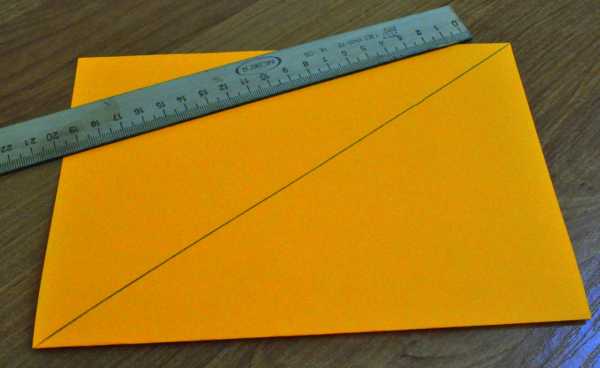 2. Для изготовления листа берем лист цветной бумаги, сворачиваем пополам, чертим диагональную линию.