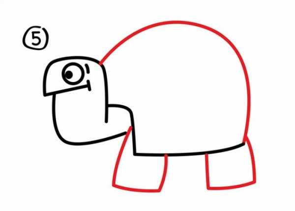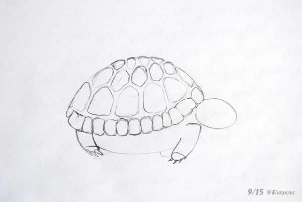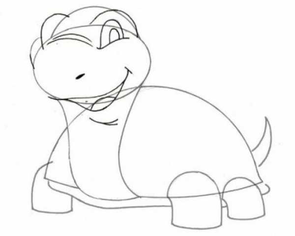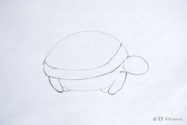 Нарисуй три ноги (четвертую мы не видим). Под панцирем проведи линию — это тело животного. И еще одна важная деталь — маленький острый хвостик.
