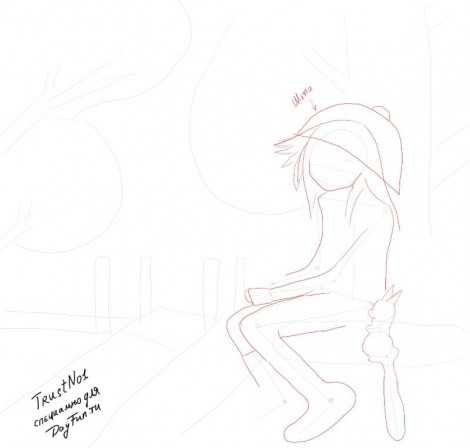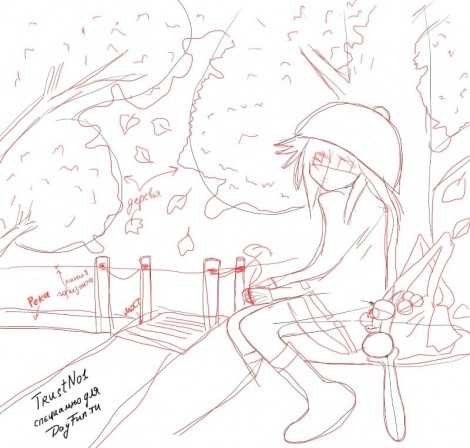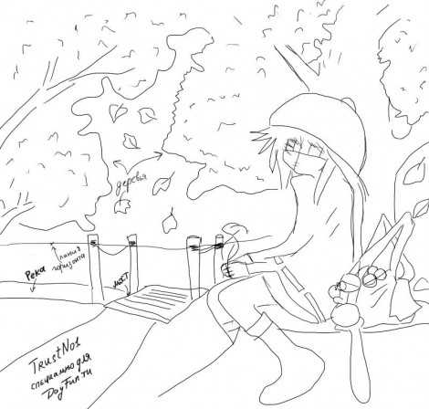 Шаг первый. Рисуем эскиз. Спичечный человечек сидит на пеньке. Возле него кругами обозначим тело белки. На заднем плане рисуем форму деревьев и моста. Думаю, с этим сложностей не будет, такие каракули все дети умеют рисовать. Но идем дальше!