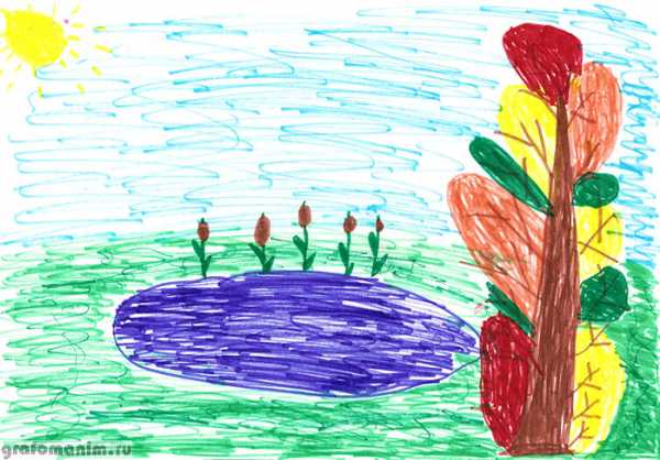 Берёзки у пруда. Рисунок моей дочки, 7 лет