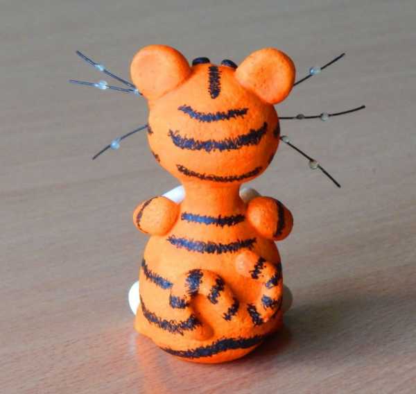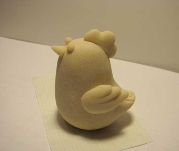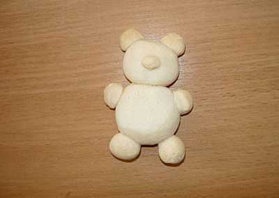 2. Теперь приступаем к лепке фигурки: делаем один шарик среднего размера для головы, побольше — для туловища и 7 овалов поменьше для лапок, ушей и носика. Соединяем все между собой. Затем кладем изделие в духовку и сушим в течении часа. После засыхания, вытащите поделку и остудите ее.