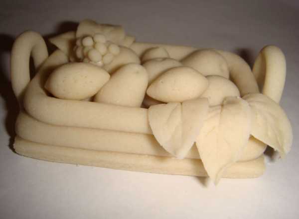Такое тесто отлично держит форму, из него можно делать небольшие тонкие элементы, а при определенно «набитых» руках можно делать вещи, внешне неотличимые от хорошего фарфора.