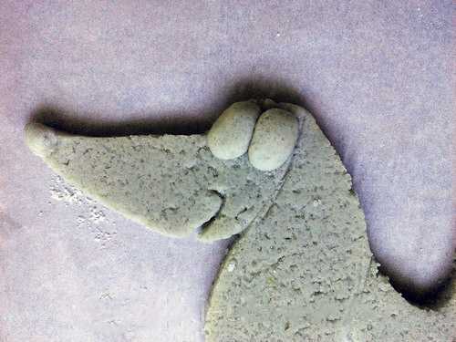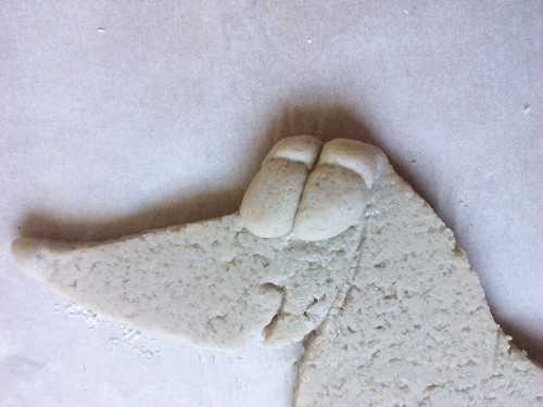 5. Для того, чтобы придать объем, скатайте из теста овал, приклейте его на ухо и загладьте мокрым пальцем стык.
