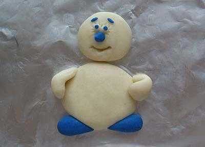 4. Возьмите синее тесто и слепите совсем маленькие шарики, сделайте из них блинчики. Это будут зрачки. Из колбасок сделайте брови и сформируйте морковку-нос.
