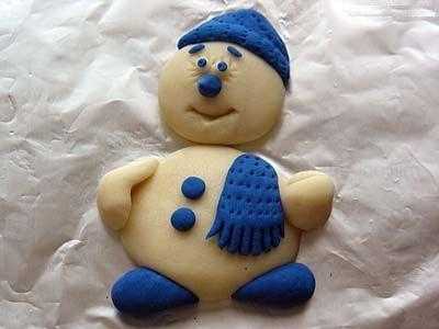 2. От белого шара отщипываем кусок для головы и сплющиваем его до формы лепешки. Под этой лепешкой располагаем еще один кусочек-лепешку — тело снеговика. Зубочисткой аккуратно оформите рот, а также отметьте расположение глаз.