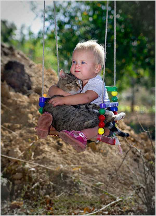 Трогательная картинка: ребёнок и кот. Ребёнок с котом в обнимку сидит на качелях!) Скучно малышу без кота, а с ним полная гармония!)