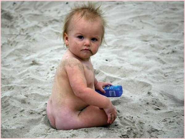 Сидит ребёнок в песочнице и с увлечением играет. Голенький ребёнок на картинке весь извозился в песке!)