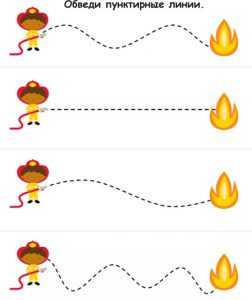 Помоги пожарным потушить огонь — обведи пунктирные линии: