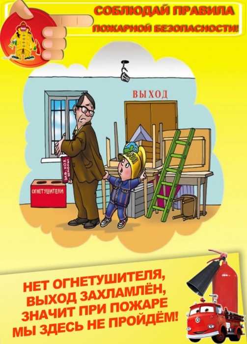 Нет огнетушителя, выход захламлен, значит при пожаре мы здесь не пройдем!
