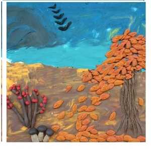3.Картина “Листопад” выполнена Матвеевой Катей, 2 класс. Проходили тему- смешивание пластилина.