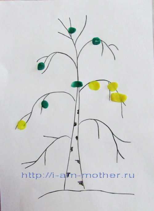 7. Используя пластилин разных цветов, украшаем деревце листьями, ведь осень разукрашивает их разными красками. Не забываем хвалить за старание.