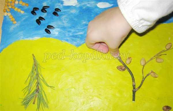Все дополнительные элементы клеятся на картину с помощью пластилина. Его маленький кусочек наносится на будущей элемент картины, например, семечку, а затем с небольшим усилием прижимается к листу картона.