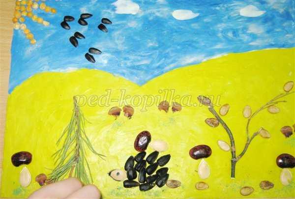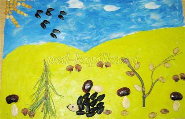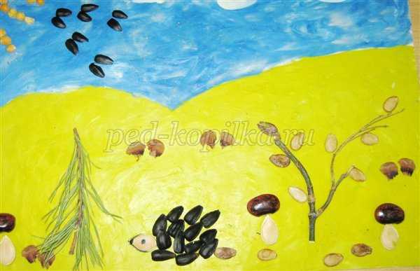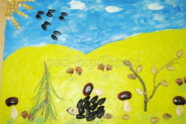 Удобно расположив лист белого картона, на нём рисуется линия горизонта. После чего используя пластилин жёлтого и синего цвета, рисуется небо и земля. Пластилин раскатывается так, чтобы слой получался как можно тоньше. После чего в левом углу из гороха делается солнце. Клин улетающих журавлей выполняется из семечек. Деревья формируются из раскатанных в трубочку пластилиновых заготовок или берутся настоящие веточки. Из семян арбуза и тыквы делаются листочки. Используя семечки от тыквы и подсолнуха, создаётся ёжик. Его лапки лучше всего выполнить из приплюснутого шарика коричневого цвета с нанесением зубочисткой рельефа пальцев.