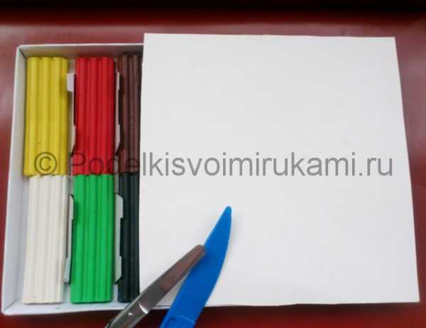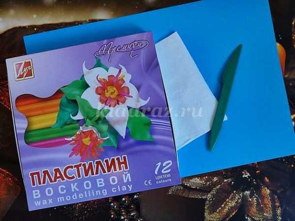 1. Откройте новенький набор пластилина для увлекательного творчества и выберите нужные цвета. В качестве холста для картины используйте картон. Также в работе понадобится пластмассовая стека.