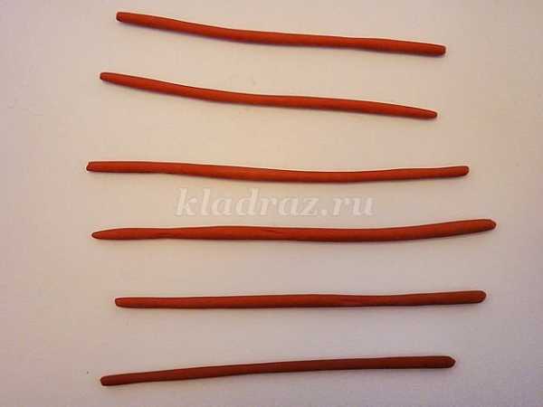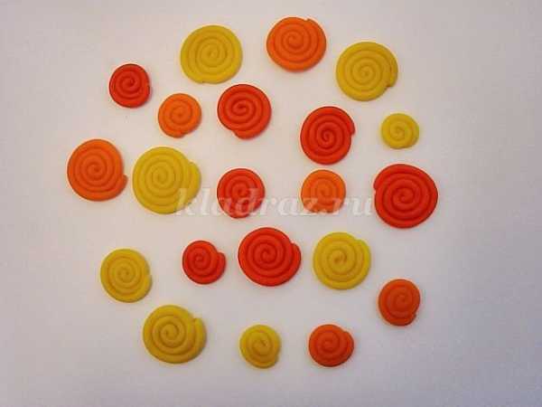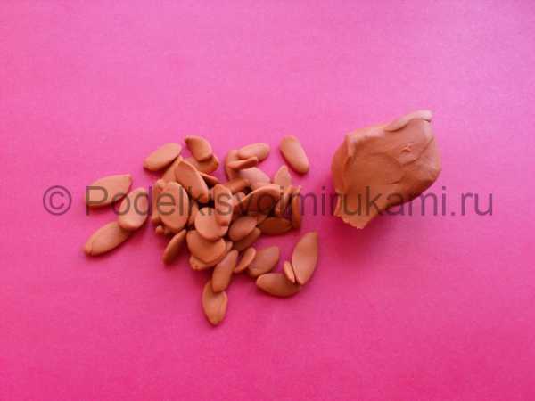 8. Мягкий оранжевый кусочек поделите на маленькие порции и слепите продолговатые листики.