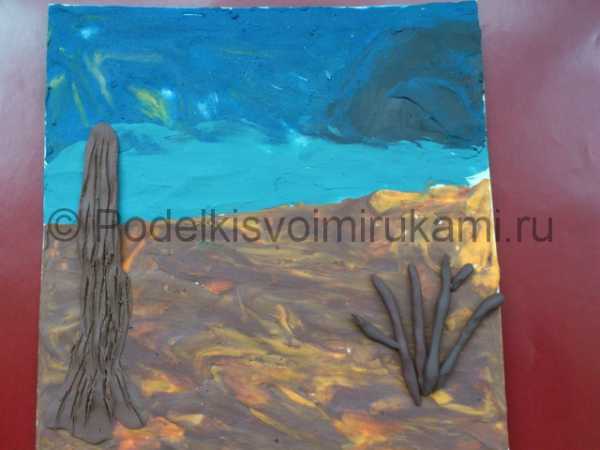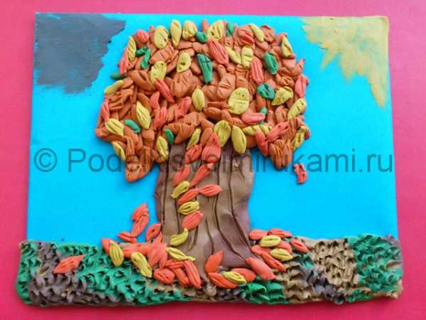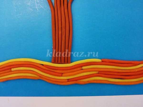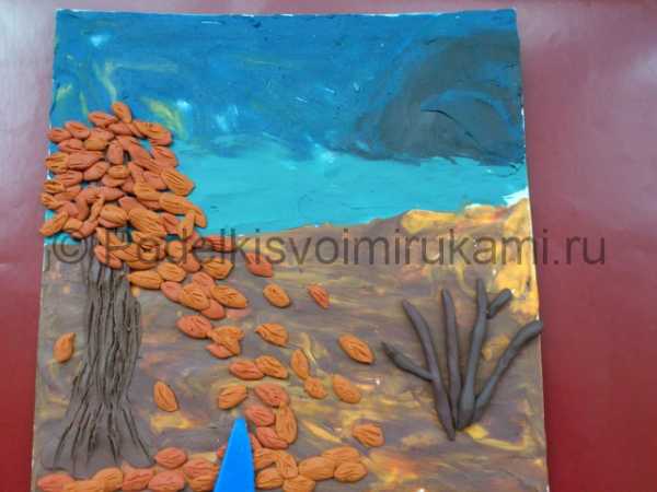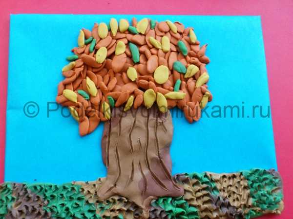 Затем, делается ствол и ветви. Используя пластилин коричневого цвета, скатываются «колбаски», после приклеивающихся к заготовке. При этом они немного расплющиваются. С помощью зубочистки или острозаточенной спички на листочках выполняются прожилки. Дерево готово. При желании в углу картины можно изобразить солнышко, расплющив шарик жёлтого цвета и обрезав излишки, а внизу сделать травку. Для этого скатываются зелёные колбаски, а после размазываются внизу картона.