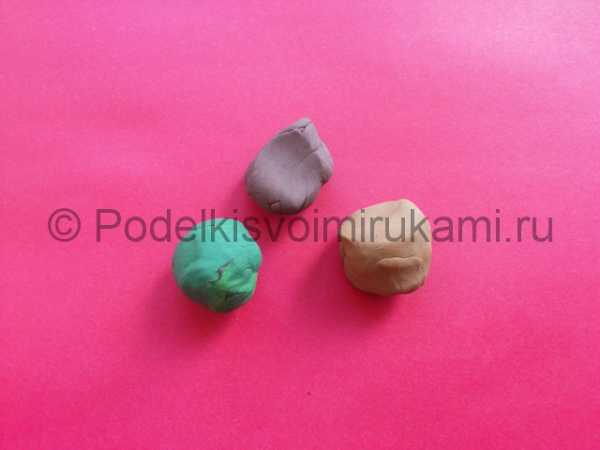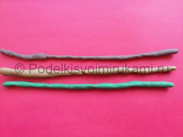 2. Для лепки основания рисунка разомните в руках темно-зеленый, коричневый и бежевый пластилин.