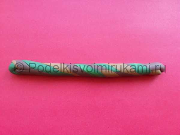 4. Скрутите колбаски в одну толстую колбаску, перекрутив отдельные сегменты пластилина между собой.