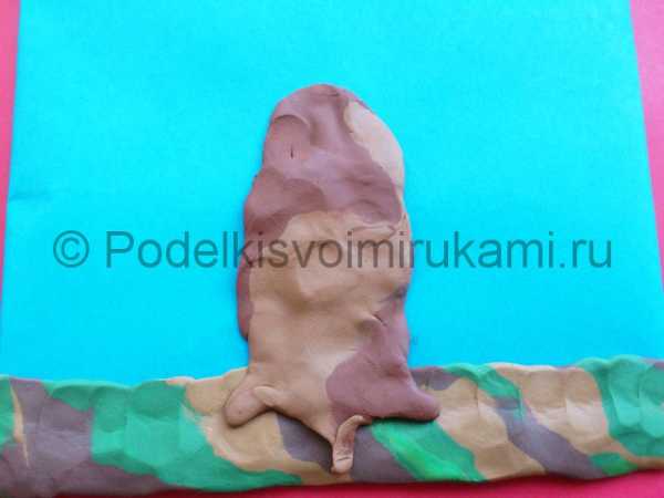 6. Слепите также между собой темно-коричневый и бежевый пластилин, налепите полученную массу вместо столба будущего дерева.